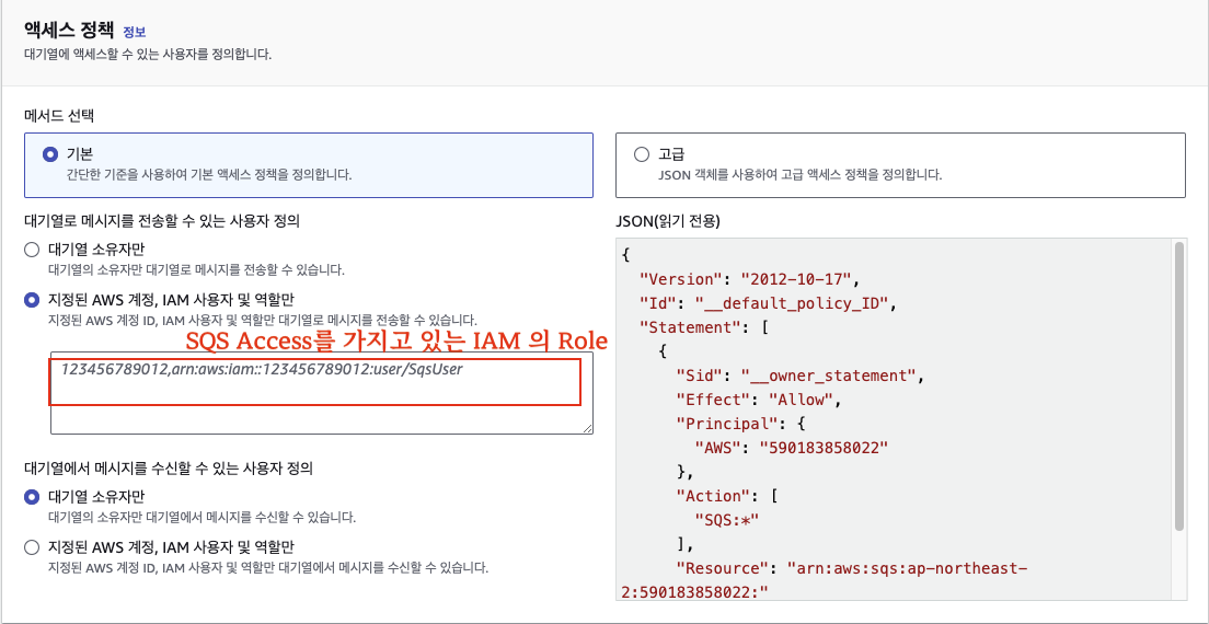 ์ฌ๊ธฐ์ ๋๊ธฐ์ด์ ๋ฉ์ธ์ง๋ฅผ ๋ณด๋ผ ์ ์๋ ์ฌ์ฉ์์ ๋ฐฉ๊ธ ๋ง๋ค์๋ IAM์ Role์ ๋ฃ์ด์ฃผ๋ฉด ๋๋ค.