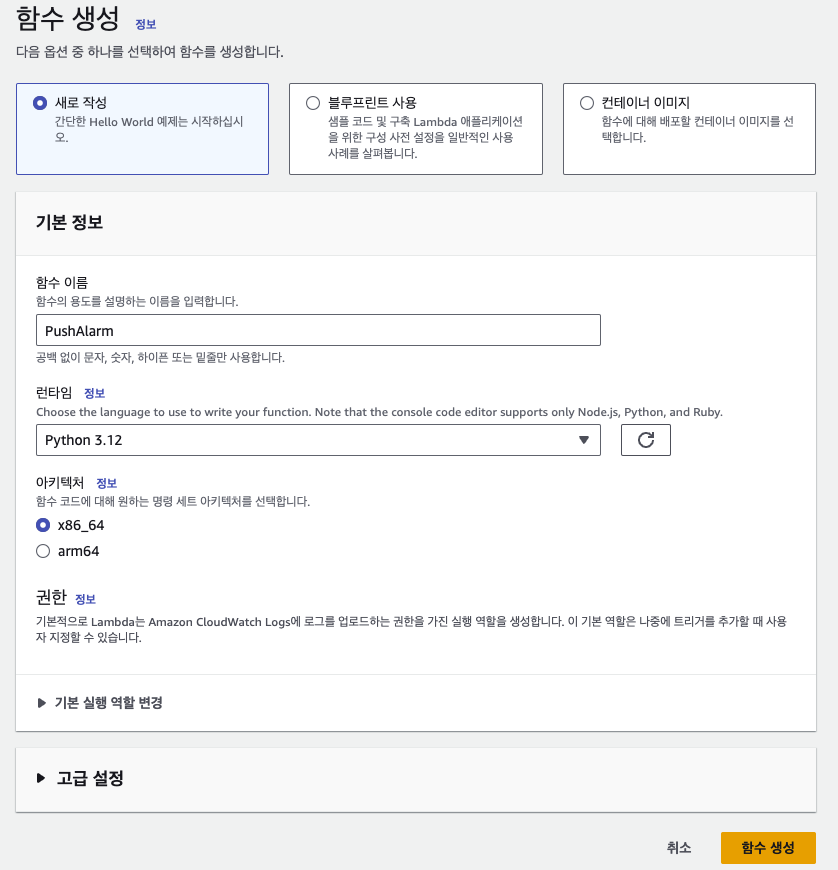 ๋ค์์ผ๋ก Lambda ํจ์๋ฅผ ์์ฑํ๋ฉด ๋๋๋ฐ, ๋ฐํ์ ์ธ์ด๋ ํ์ด์ฌ์ผ๋ก ํ๋๊ฒ ๊ฐ์ฅ ์ข๋ค.