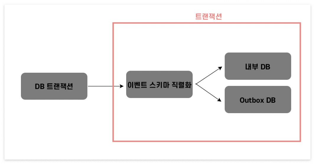 ๋ด๋ถ ํ ์ด๋ธ ์ ๋ฐ์ดํธ์ ์์๋ฐ์ค ํ ์ด๋ธ ์ ๋ฐ์ดํธ๋ฅผ ๋จ์ผ ํธ๋์ญ์ ์ผ๋ก ๋ฌถ์ด ์ด๋ฒคํธ์ DB ํธ๋์ญ์ ์ ์ ํฉ์ฑ์ ๋ณด์ฅํ๋ ๋ฐฉ๋ฒ์ด๋ค.